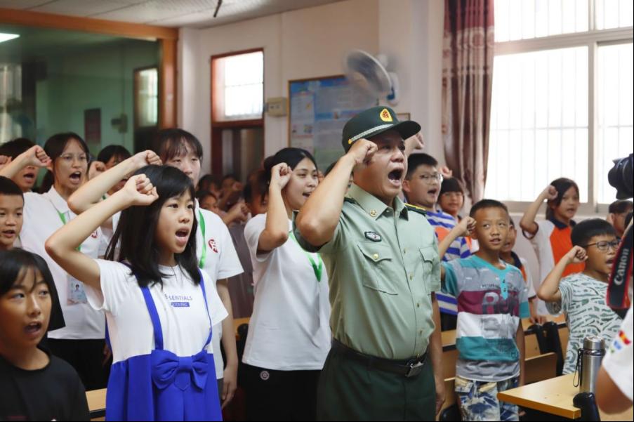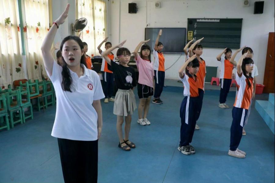 7月5日上午,第一二节课是红色小小宣讲员培训课。曹丽丽老师在课程中开展了语言发音基础知识培训,同时通过跟读、绕口令、小游戏及现场抢答等多种方式,帮助同学提升讲解能力和朗诵能力,培养了广大青少年从小对党和社会主义祖国的朴素情感,让红色基因、革命薪火代代相传。第三节课是爱国主义教育课。团队志愿者陈俊诗带领学生开展升旗仪式,唱响国歌,同时讲解了红色旗帜的种类和作用,提升了同学们的爱国情感。第四节课是音乐舞蹈课。为了顺利开展文艺汇演活动,音乐舞蹈课分为三部分同时进行,团队志愿者何丽珊带领12名同学进行舞蹈练习、团队志愿者李欣带领16名同学进行匕首操的训练以及团队志愿者陈佳瑶带领剩余同学进行合唱和手语操的练习。