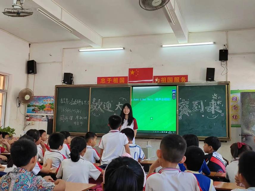 7月6日早上乘风企航三下乡实践队正式在企水镇中心小学展开授课,实践队早早到了教室,摆放桌椅,打扫清洁,按照昨天队长的工作安排,各就各位,准备迎接学生的到来。随着家长和学生陆陆续续的到校,家长对孩子的叮嘱声、学生的嬉闹声充斥着整个教室,学生脸上满是欣喜与期待,实践队成员积极跟学生互动,教室氛围其乐融融。学校主任和实践队安排的班主任先后就课堂纪律、课间休息安全等方面对学生做出了要求,各成员依次上台向同学们介绍自己与所教科目,简单的见面拉开了教学的序幕。早上的趣味英语课堂由特邀的英语专业生邓委亭授课,她带领同学们学习英语歌曲《Something just like this》,同学们兴致勃勃,紧跟老师的教学,能够较为完整的唱出来歌曲。