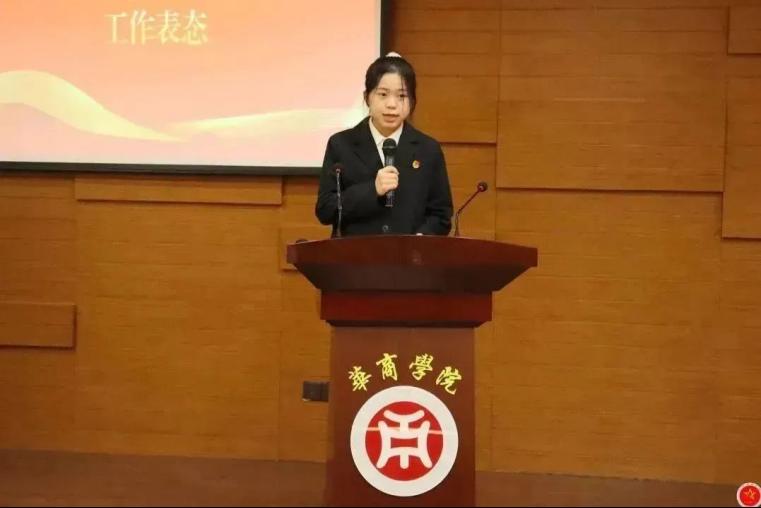 张靖怡同学代表新一届学生骨干作工作表态,并提出了三点建议:一是坚持党的思想领导,拥护党的政策方针;二是找准自身定位,明确组织责任;三是加强团队合作,锤炼奋斗精神。她表示,作为学生骨干要有先锋模范作用,要勇于担当、敢于拼搏,以艰苦拼搏、开拓创新的精神奋勇争先,续写组织新华章。
