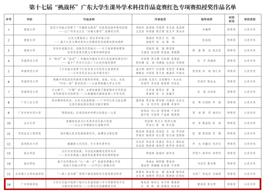 此前,该团队成功入选 2023 年全国“七彩假期”志愿服务示范团队,作品曾获第十七届“挑战杯”广东大学生课外学术科技作品竞赛红色专项赛省级特等奖、入选 2023 大学生社会实践成果“千校千项”网络展示活动“项目优秀奖”与“视频优秀奖”、入围 2023 年"我的返家乡实践故事"征集活动展示点赞环节等荣誉。