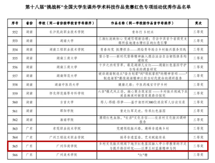 我校2023年暑期三下乡社会实践团队“青衿萤火”作品《乡村文化振兴阈下地方红色基因融入中小学教育的不足与提升路径研究——以潭王村蓝康精神为例》荣获第十八届“挑战杯”全国大学生课外学术科技作品竞赛红色专项活动三等奖!