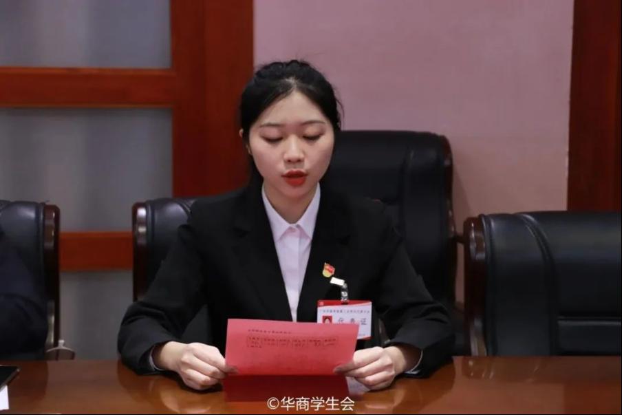 威廉希尔williamhill中文第二届学生会主席团成员黄朵懿向大会作工作报告。报告提到,过去一年中校学生会主要开展的工作有:一、不忘初心跟党走,扎实强化思想引领;二、围绕大局谋服务,始终把提升服务水平作为工作核心;三、把握学业主线,学风建设形式多样;四、加强文化建设,丰富校园文化生活;五、强化学生会改革,进一步提高学生会战斗力;六、投身社会实践,彰显责任担当。在未来,校学生会将继续坚持党的领导,团结带领华商学子坚定理想信念、奋发成长成才、助力创新创造、展现青春作为,在全面建设社会主义现代化国家的火热实践中贡献华商青春力量。
