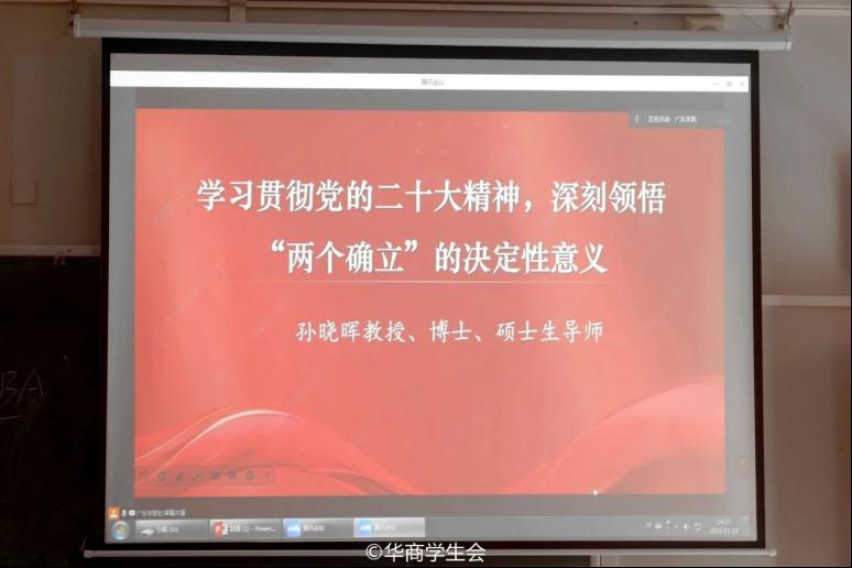 ——第一项学习议程。广东财经大学马克思主义学院孙晓晖教授以《学习贯彻党的二十大精神,深刻领悟“两个确立”的决定性意义》带领大家展开学习。孙教授结合时事热点和自身事例,从“为何学、学什么、怎么学”三个角度,阐释了党的二十大召开的时空背景和重大意义、新时代党和国家事业取得的历史性成就和历史性变革,以及如何深刻领悟“两个确立”的决定性意义、坚决做到“两个维护”。在孙晓晖教授的带领学习下,各级学联学生对党的理论理解更加深刻,并努力表示争做时代新青年。