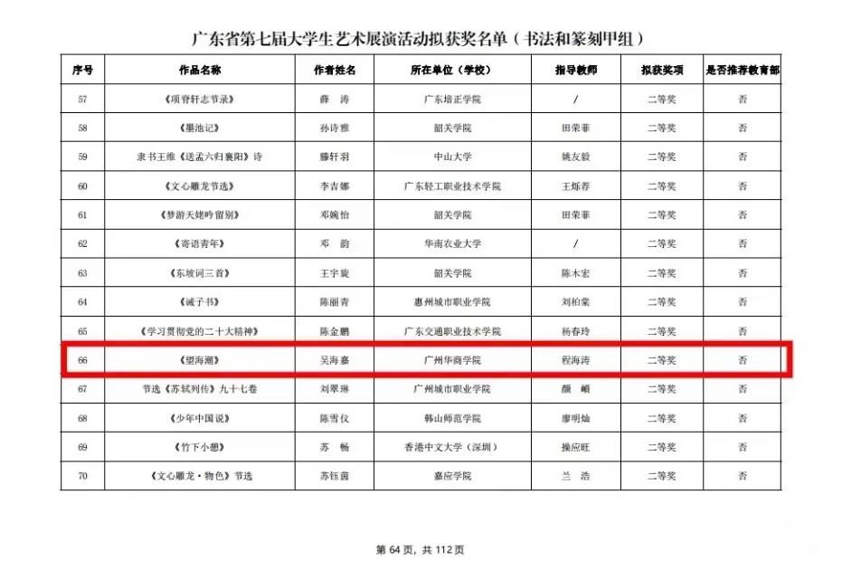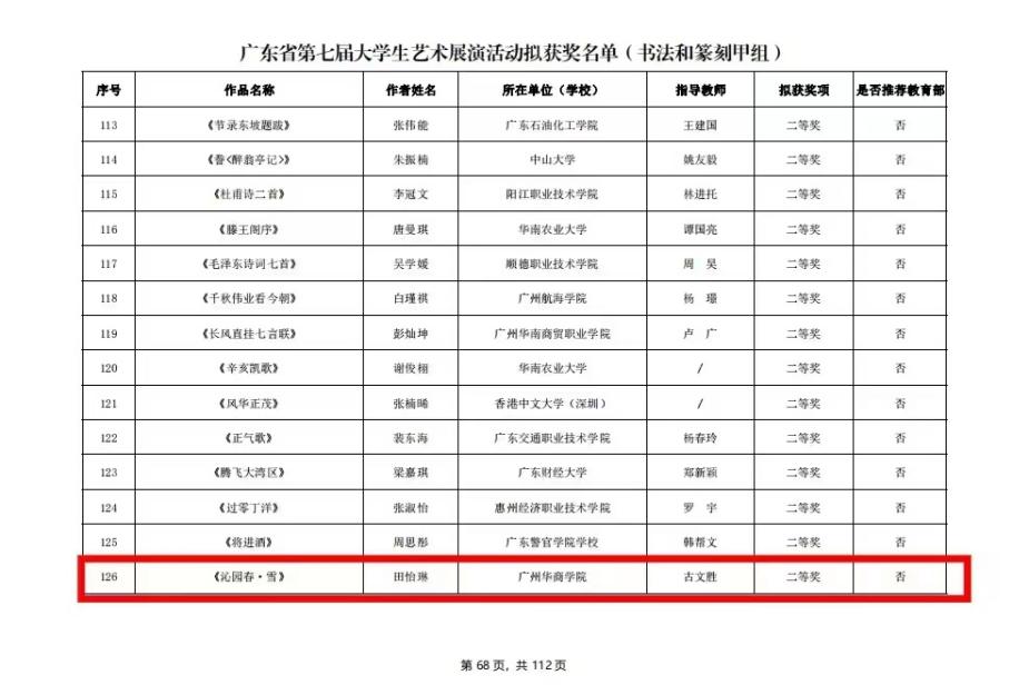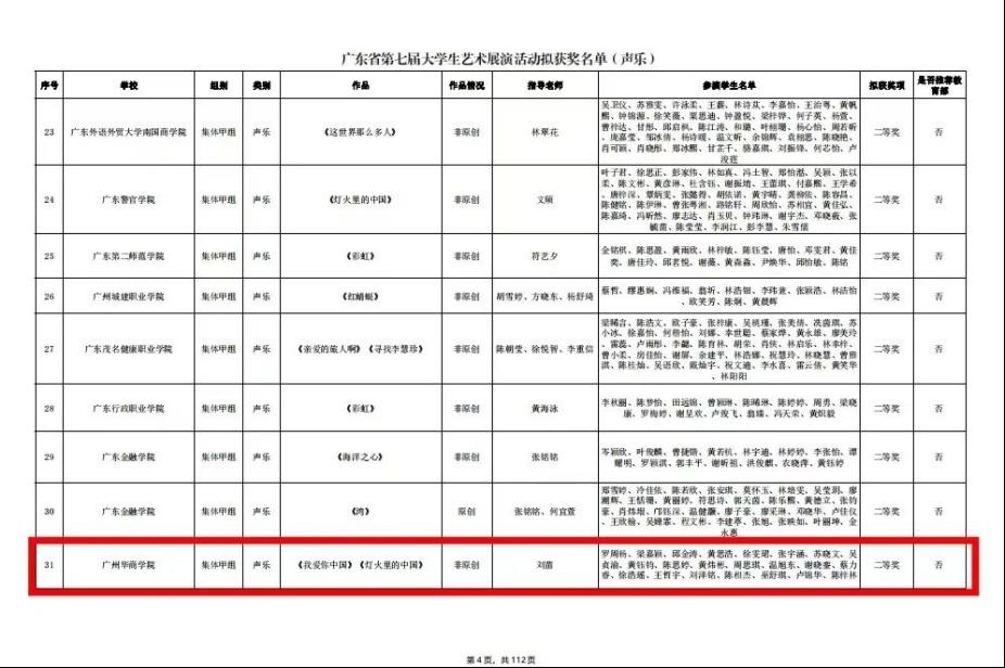 根据《广东省教育厅关于举办全省第七届大学生艺术展演活动的通知》要求,经组织专家评审,共评出拟获奖作品1158个,其中声乐类节目105个,器乐类节目80个,舞蹈类节目103个,朗诵类节目54个,戏剧类节目35个、绘画类作品137个、书法和篆刻类作品234个、摄影类作品96个、设计类作品155个、微电影类作品68个、校长风采作品7个、艺术实践工作坊20个、优秀案例64个、优秀组织奖27个。