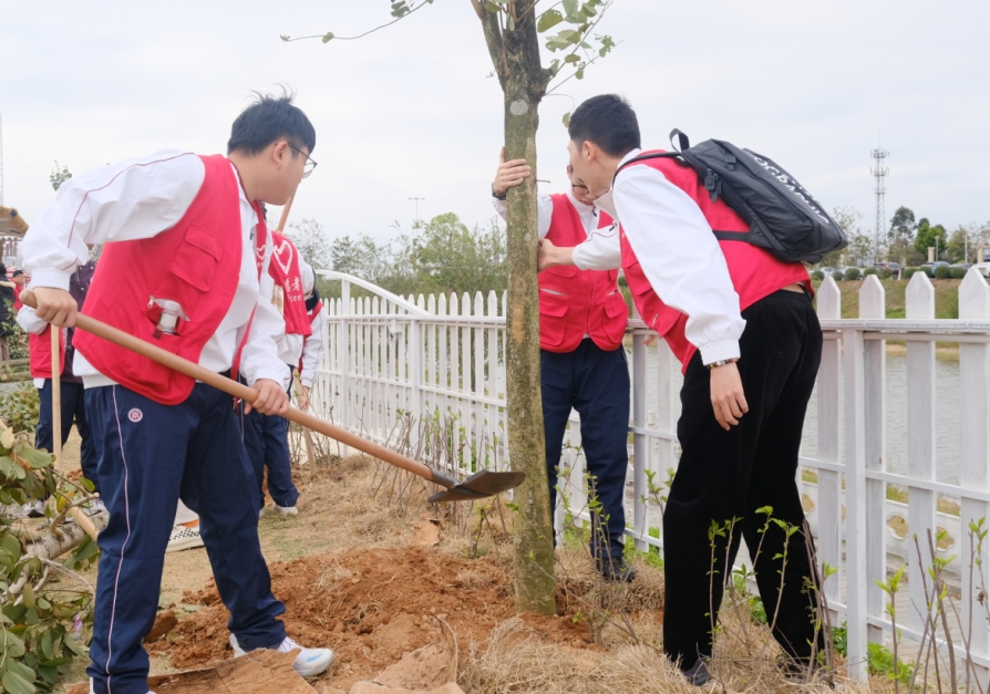 华商青年志愿者们干劲十足,挥锹挖土、栽植树苗,互相配合,为太平村增添新绿。经过一小时的辛勤忙碌,同学们与区总工会、荔湖街主要领导、劳模代表、我校教职工等合力栽下100棵宫粉紫荆,为“绿美广东”增添色彩。公益林中,新绿迎风挺立,展现出蓬勃生机,诠释青年的担当和责任。
