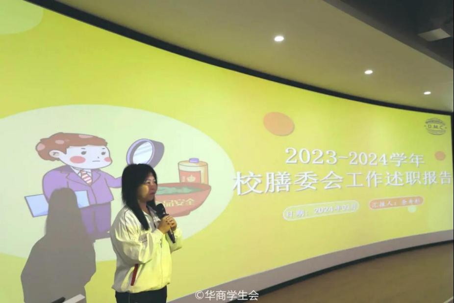 ——膳食管理委员会。膳食管理委员会代表分别从工作回顾、工作不足、思想引领、未来展望四个方面进行述职。为保障师生的饮食安全,膳委会组织工作人员开展周检日检工作,开展“后厨开放日活动”、“大众餐评选活动”、“第七届安全知识竞赛”等活动,并通过活动普及消费者权益知识,取得较好的反响。在未来的工作中,膳食管理委员会将会根据分校区的情况举办不同的特色活动,增强成员之间的归属感以及团队凝聚力。
