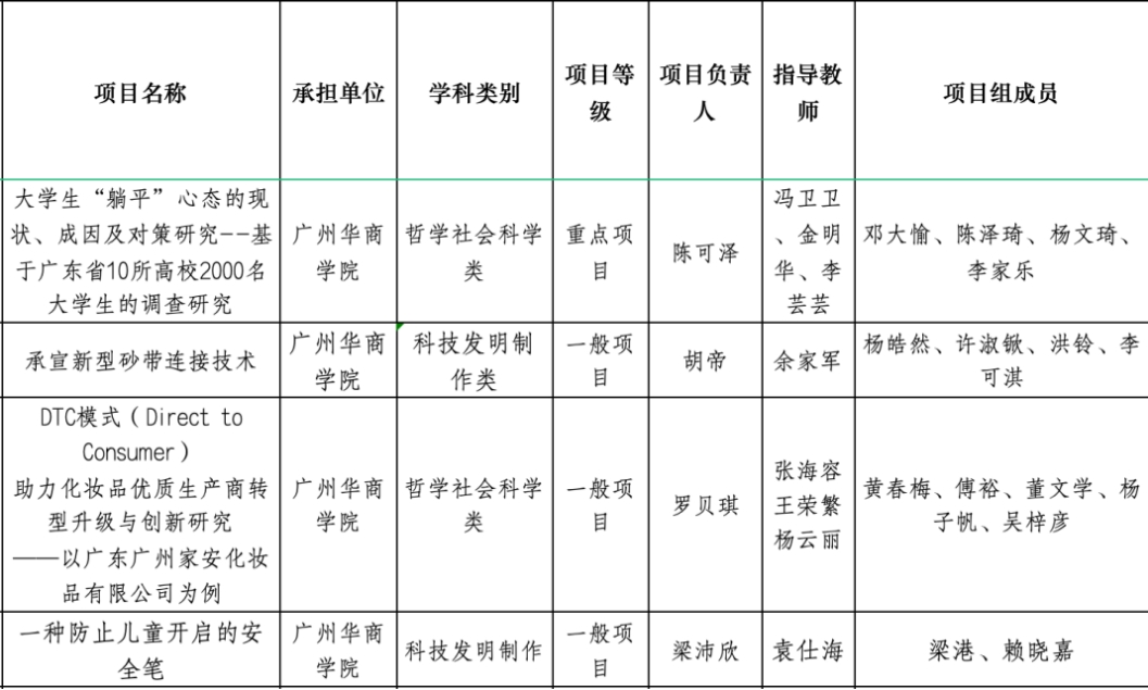 ——2023年广东省科技创新战略专项资金。由团省委、省财政厅联合设立的2023年广东省科技创新战略专项资金(大学生“攀登计划”科技创新培育),我校7个项目获得立项资助,其中重点项目1项、一般项目6项,共获得省财政专项资助12万元。日前,被抽中的四个项均已顺利完成校级中期检查。其中《大学生“躺平”心态的现状、成因及对策研究——基于广东省10所高校2000名大学生的调查研究》也获得第十七届“挑战杯”广东大学生课外学术科技作品竞赛省赛三等奖。《承宣新型砂带连接技术》获第十四届中国大学生服务外包创新创业大赛全国三等奖。