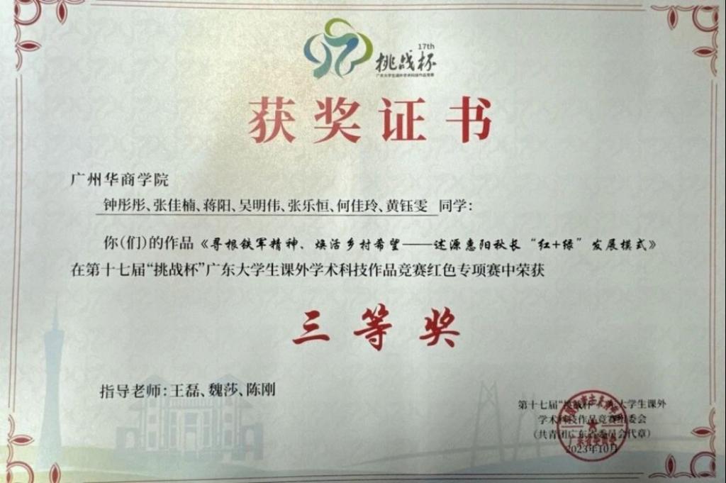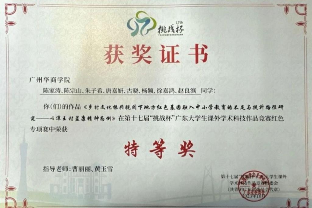 ——第十七届“挑战杯”广东大学生课外学术科技作品竞赛红色专项赛。第十七届“挑战杯”广东大学生课外学术科技作品竞赛红色专项赛中,我校暑期三下乡全国重点社会实践队伍作品——《乡村文化振兴视域下地方红色基因融入中小学教育的不足与提升路径研究—— 以潭王村蓝康精神为例》喜获省级特等奖,《寻根铁军精神、焕活乡村希望——述源惠阳秋长“红+绿”发展模式》、《关于红色景区推动红色教育的调研报告 —— 以中共三大会址纪念馆为例》荣获三等奖!