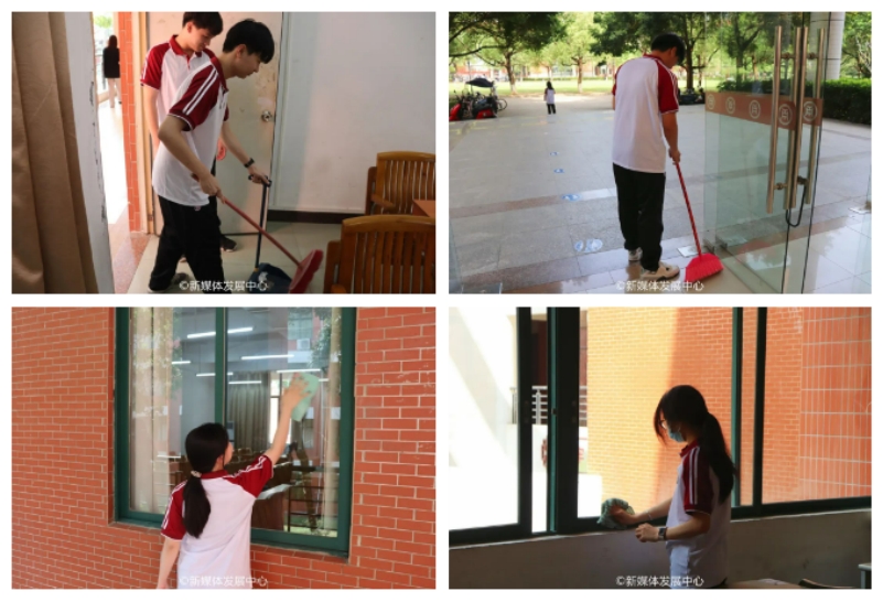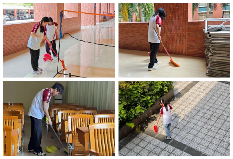 以校为家,奏响劳动乐章。志愿者们团结协作、配合默契,共同维护校园环境,在劳作中感受实践的智慧。校道上、课室里,大家认真负责、齐心协力,共同打造更美丽、和谐的华商校园。