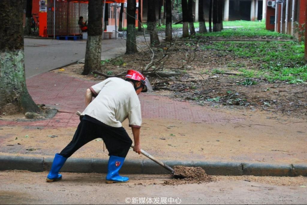 在暴风雨过后,华商学院广州校区校园内到处是树枝吹倒、杂枝散乱等情况。签到和简单动员过后,志愿者们按照分工,各自奔向所负责的区域开展工作。他们弯腰俯身,齐心协力,不怕脏、不怕累,积极投身到清理校园环境的行动中,对图书馆、励志楼、西区宿舍附近校道上的落叶、积水、淤泥等进行清理,充分发扬青年志愿者能吃苦、敢担当的精神。现场气氛热烈,呈现一片热火朝天的劳动场面。