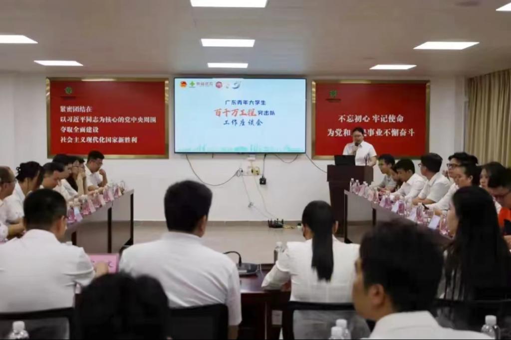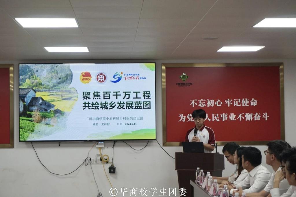 广东青年大学生“百千万工程”突击队工作座谈会上,我校“百千万工程”突击队代表“小旅进镇”作汇报分享。史梓健同学谈到,团队成员结合当地实际,通过深入挖掘和保护红色资源,结合自然风光和传统文化,推动红色文化与乡村旅游的融合发展;以乡村文创为核心,打造文化IP,开发特色文创产品,并通过设计宣传册、编写习俗志等方式,为助力西岸村成为乡村振兴示范村贡献青春力量。