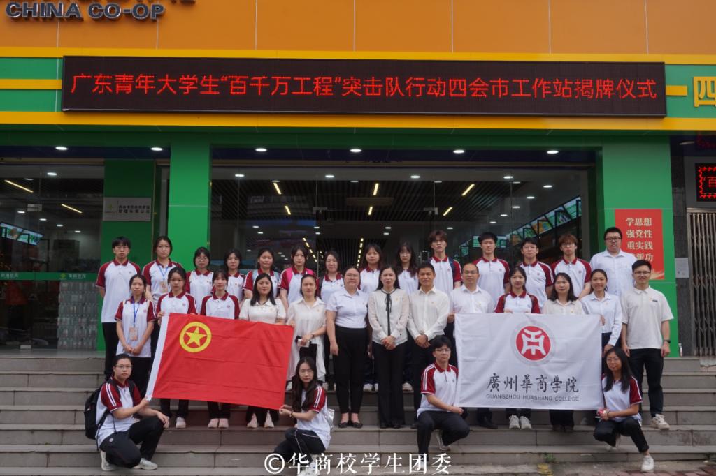5月11日上午,在四会市委、市政府的统筹部署及团肇庆市委的指导下,团四会市委联合四会市供销社、佛山市驻黄田镇帮镇扶村工作队打造的全省首个广东青年大学生威廉希尔williamhill中文县级工作站(四会市工作站)正式揭牌投用。四会市委副书记吴鋆,佛山市驻肇庆帮扶指挥部、团肇庆市委、团四会市委、佛山市禅城区驻四会市帮扶工作组、四会市供销社、黄田镇人民政府等相关负责同志共同为广东青年大学生威廉希尔williamhill中文四会市工作站揭牌。校团委陈巧巧老师带领50余名我校肇庆校区百千万工程突击队队员、青马班学员、青年团员代表正式入驻工作站开启首场直播。