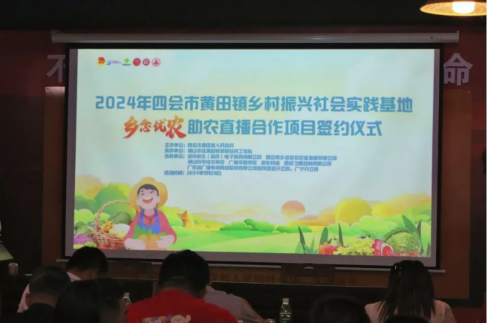 5月28日下午,由四会市黄田镇人民政府主办、佛山市驻黄田镇帮镇扶村工作队承办的2024年四会市黄田镇乡村振兴社会实践基地“乡念优农助农直播”合作项目签约仪式在黄田镇江头村农军学堂举行。