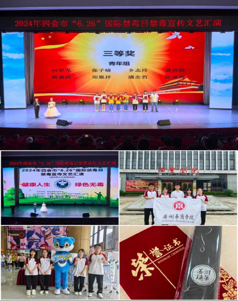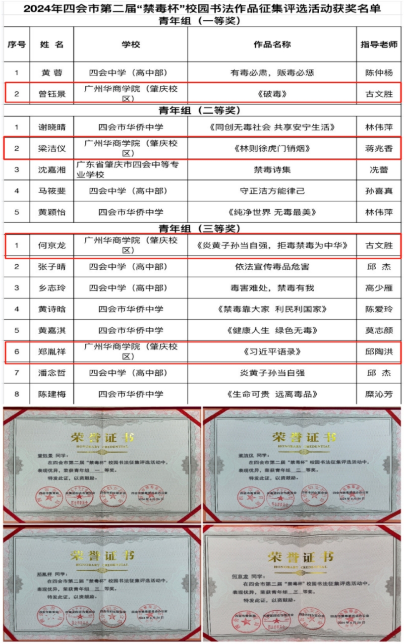2024年6月26日,迎来了第37个国际禁毒日。四会市禁毒办联合多部门,以“健康人生,绿色无毒”为主题,精心策划了一系列禁毒普法宣传活动。为深入贯彻威廉希尔williamhill中文总书记关于禁毒工作重要指示精神,全面贯彻落实党的二十大精神,加大禁毒宣传力度,提高高校学生禁毒意识,增强华商学子对毒品种类特性及危害的认识,提升居民识毒、辨毒、查毒能力,我校团委组织学生参加四会市第二届“禁毒杯”校园书法征集评选活动。活动收到超过100份报名作品,获青年组一等奖1名、二等奖1名、三等奖2名。