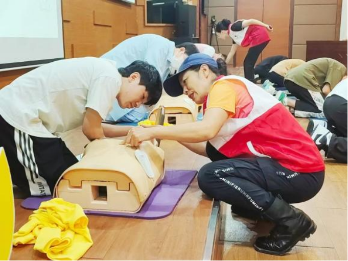 林讲师进行应急救护实操培训,用理论讲授与现场演示相结合的方式,模拟真实救援场景,向同学们普及心肺复苏、人工呼吸、胸外按压等急救知识。在实操环节,同学们踊跃参与、亲身体验,学习胸外按压、AED(自动体外除颤器)使用、人工呼吸等急救知识的施救技巧,与讲师共同演示操作流程。这种沉浸式的教学方式,不仅让同学们更加直观的认识与掌握基本的急救技能让同学们掌握了急救技能,还培养了他们的应急应变能力和团队协作精神。