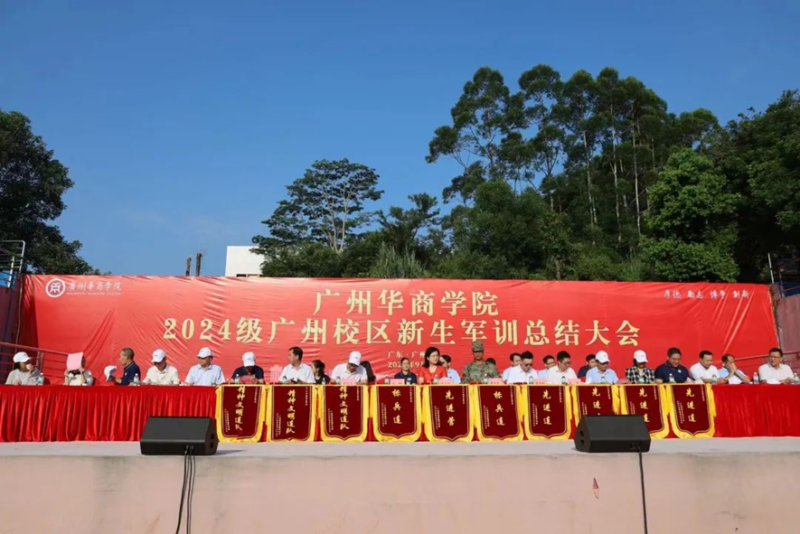 校长助理李远飞宣读《关于表彰2024级广州校区新生军训优秀集体及个人的决定》。主席台上的校领导向荣获先进营称号、标兵连队称号、先进连队称号、精神文明连队称号的连队及荣获优秀教官、军训标兵称号的22名教官、128名新生进行表彰。