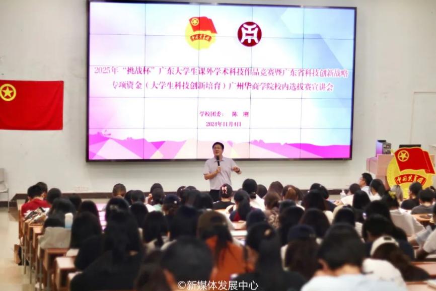 为帮助华商学子全面了解和掌握“挑战杯”赛事,拓宽视野、激发创新潜力与活力,提升我校学生在“挑战杯”大学生课外学术科技作品竞赛中的竞争力,营造敢于创新、勇于挑战的学习氛围,11月4日,校团委在广州、肇庆双校区同步开展校团委学术活动周——“挑战杯”创赛系列讲座第一期。本次讲座由校团委陈刚书记主讲。校团委副书记陈巧巧、校团委专职团干胡万培老师、何以立老师及线下线上近1000名同学参与其中。
