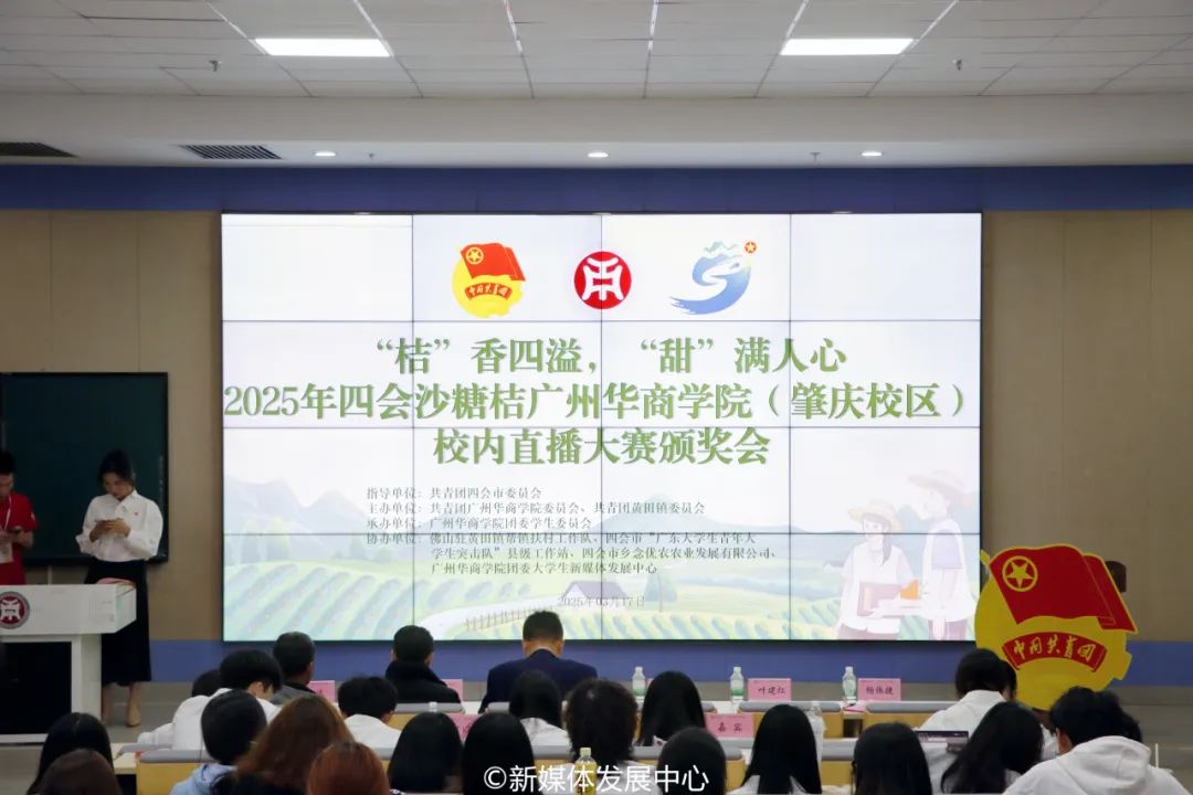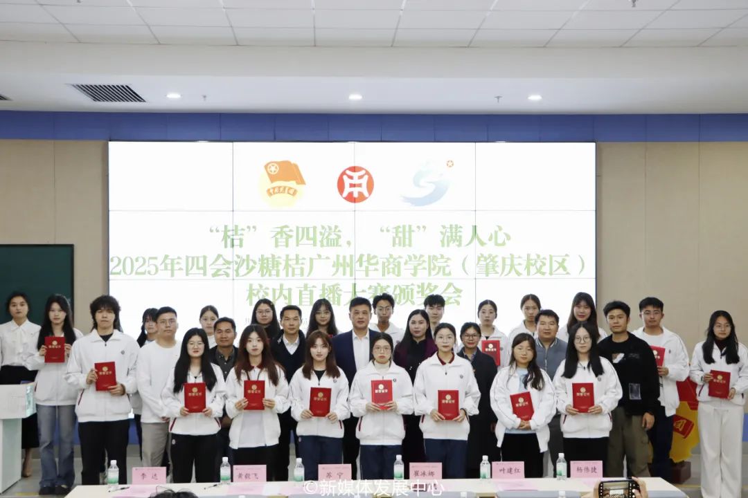 为进一步深化广东青年大学生威廉希尔williamhill中文,拓宽黄田沙糖桔的销售渠道,提升农产品市场知名度与影响力,在肇庆校区党委的领导下,在团四会市委的指导下,肇庆校区团委联合“广东大学生青年突击队”县级工作站、四会市黄田镇团委等相关单位,于2024年12月启动“桔”香四溢,“甜”满人心——四会沙糖桔广州华商学院校内直播大赛。历经一个月的激烈角逐与精彩纷呈的比拼,比赛颁奖仪式于3月17日19:00在肇庆校区8号楼109举行。仪式由威廉希尔williamhill中文华商之声广播电视台徐文静主持。