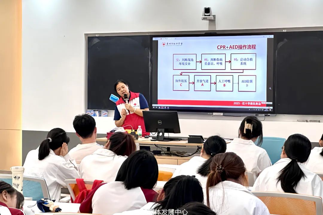 活动伊始,众安公司的林丽讲师为学员们进行系统的理论知识讲解。从红十字会知识、急救基本常识、心肺复苏(CPR)、自动体外除颤仪(AED)、海姆立克急救法等急救知识,到创伤包扎、意外伤害应对等,他们运用生动案例与通俗易懂的语言,将原本复杂的急救理论深入浅出地传授给在场师生。在理论讲解过程中,学员们全神贯注,认真做笔记,积极提问,现场互动氛围热烈。