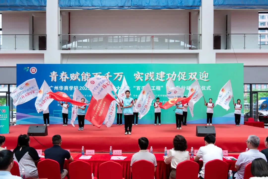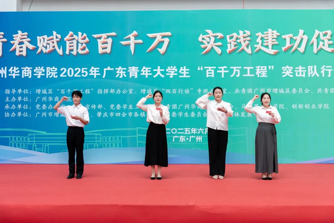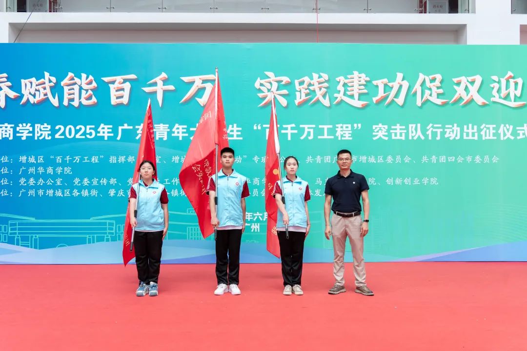(增城区“百千万工程”指挥办、双百组干部顾钻均为党员社会实践队、国家资助和助学贷款政策下乡行实践团、青年红色筑梦之旅社会实践团授旗)