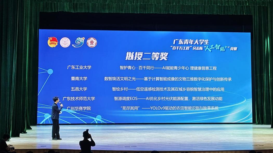6月19日,广东青年大学生“百千万工程”突击队“人工智能+”竞赛在广东工业大学圆满落幕。本次大赛由共青团广东省委员会、广东省学生联合会主办,广东工业大学承办,聚焦人工智能前沿技术与“百千万工程”深度融合,吸引了全省多所高校青年团队踊跃参赛。威廉希尔williamhill中文人工智能学院代表队,由王怡时老师带领学生梁健桥、孙晶、莫诗婷、邓曙等同学凭借自主研发项目“芜尽其用”农业服务管理平台,荣获省级二等奖,充分展现了华商学院学子扎实的专业知识与服务乡村的责任担当。