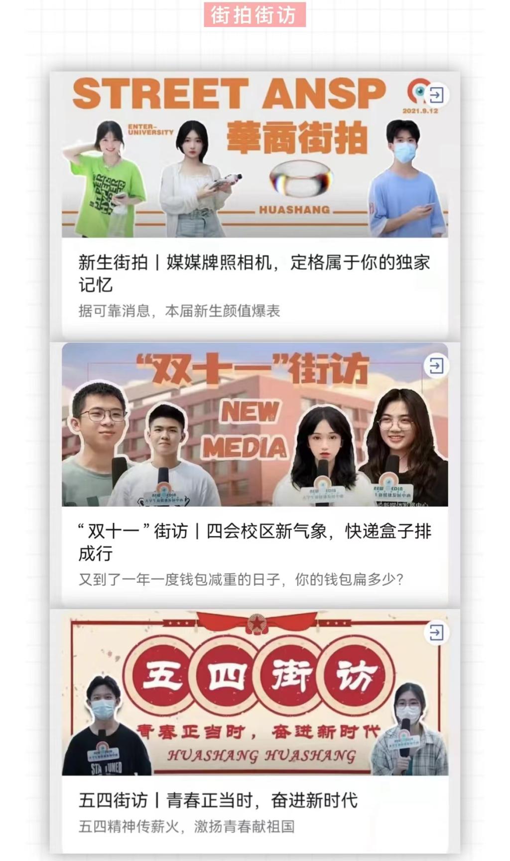 例如:“华商Swag”、“素人改造” “街头探店”、“媒媒照相馆”、“华商青年说”、“一校一师”、“街拍街访”“新生特辑”。他们将身边有趣、好玩的事情以文字、图片、视频的形式推送给大家,打造极具青春活力的校园传播平台,力求接地气又不失内涵。